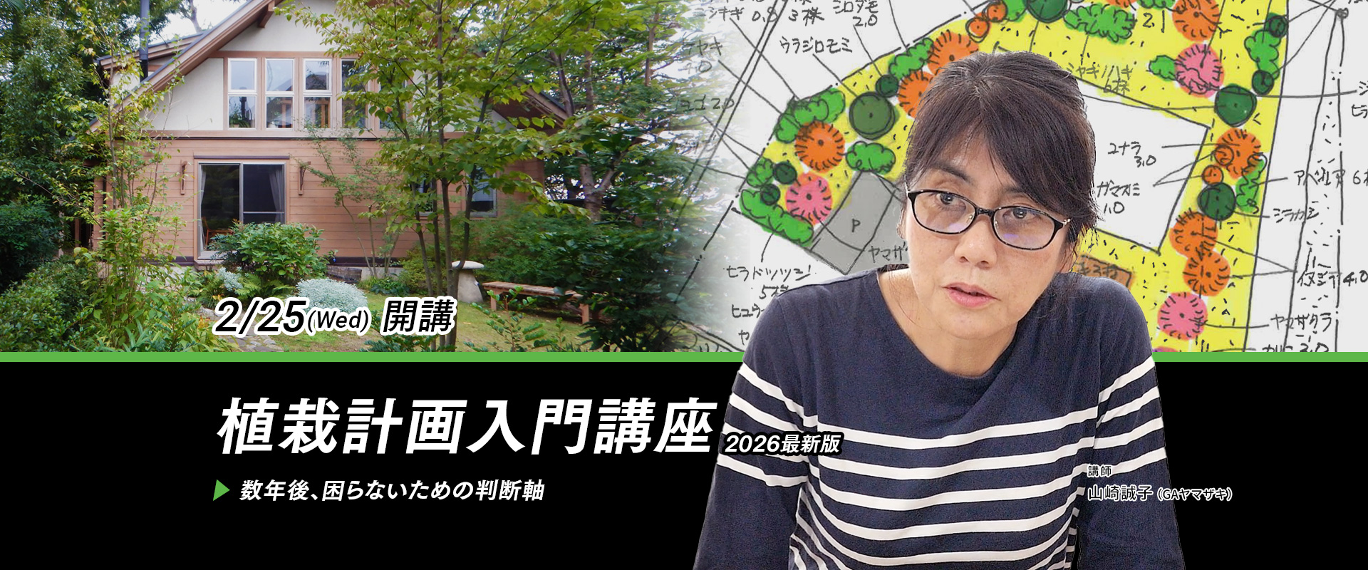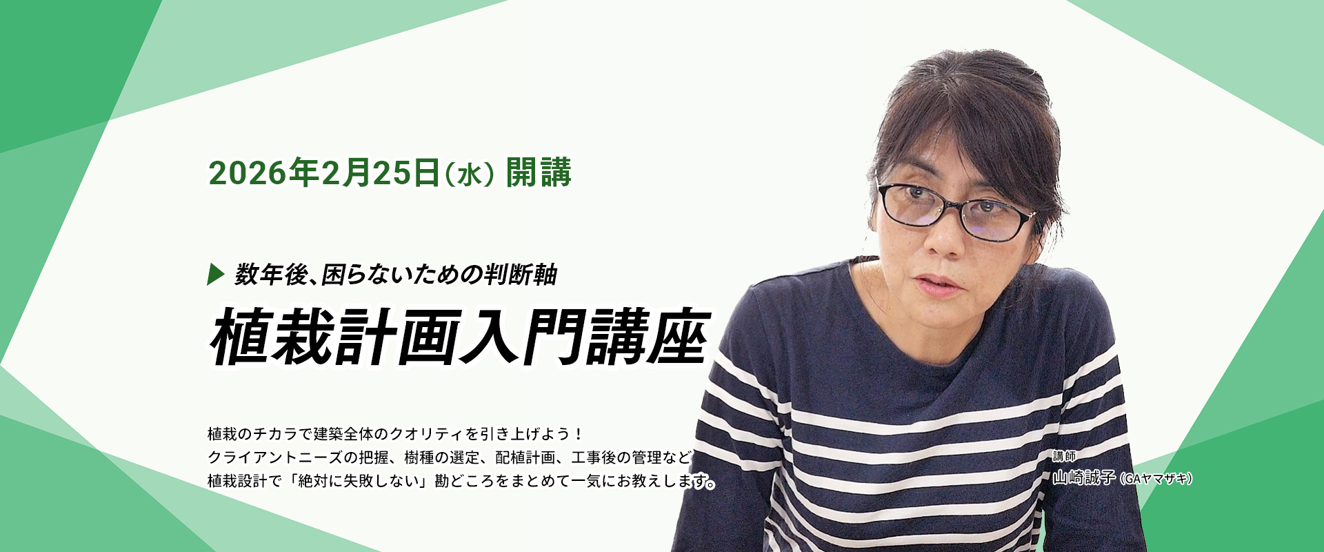 樹種選定、配植計画、コスト調整、完成後の管理など「植栽で事故らないための判断軸」を体系的に整理する実務者向けの講座です。「一過性の見栄えだけでなく、しっかりと根付いて育つ植栽」が自信をもって計画できるようになります。