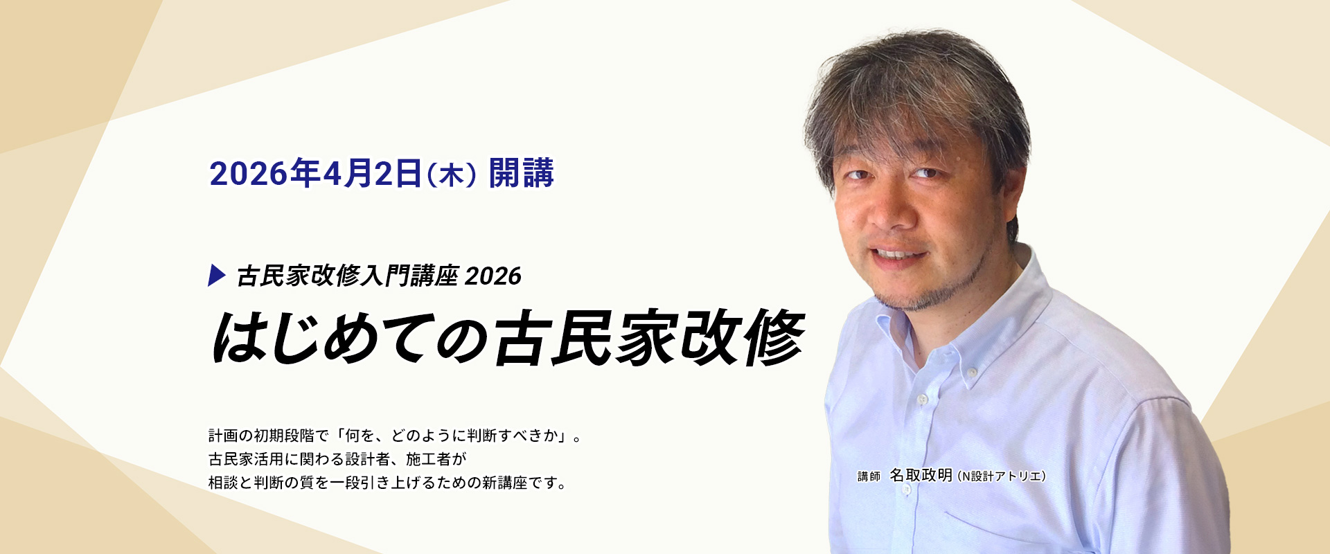 古民家を改修して、カフェや店舗、宿泊施設として活用したい! 古民家改修の企画に関わる設計者、施工者が「最初の段階で何を、どこまで判断すべきか」。それらを整理しながら、設計から施工へと進む一連の流れとその要点を押さえるための入門講座です。